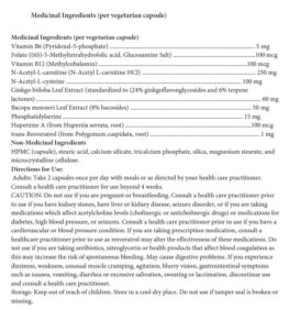N-Acetyl-Cysteine is capable of crossing the blood-brain barrier and is known to combat oxidative stress, and reduced oxidative stress may support healthier nerve tissue.[3] L-carnitine is a vital cofactor for mitochondrial oxidation of fatty acids providing the brain with an energy substrate. Acetyl-L-carnitine, an ester of L-carnitine, possesses properties that may be effective in supporting healthy cognition with age.[4,5] The phospholipid phosphatidylserine (PS) plays an important functional role in membrane-related processes in the brain and regulates the release of acetylcholine, dopamine, and noradrenaline. PS appears to support neuronal health and healthy brain function, possibly through its effect on cytokine production and their influence on microglia.*[6]